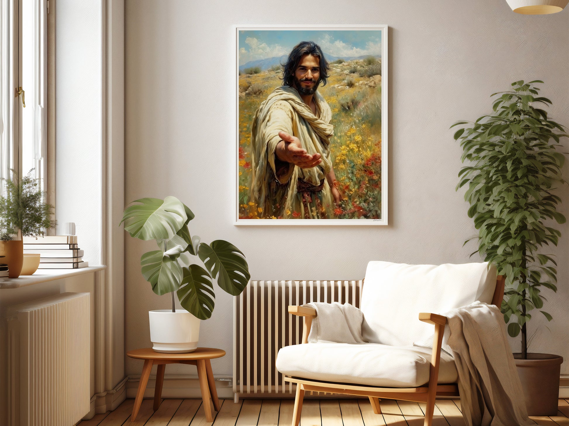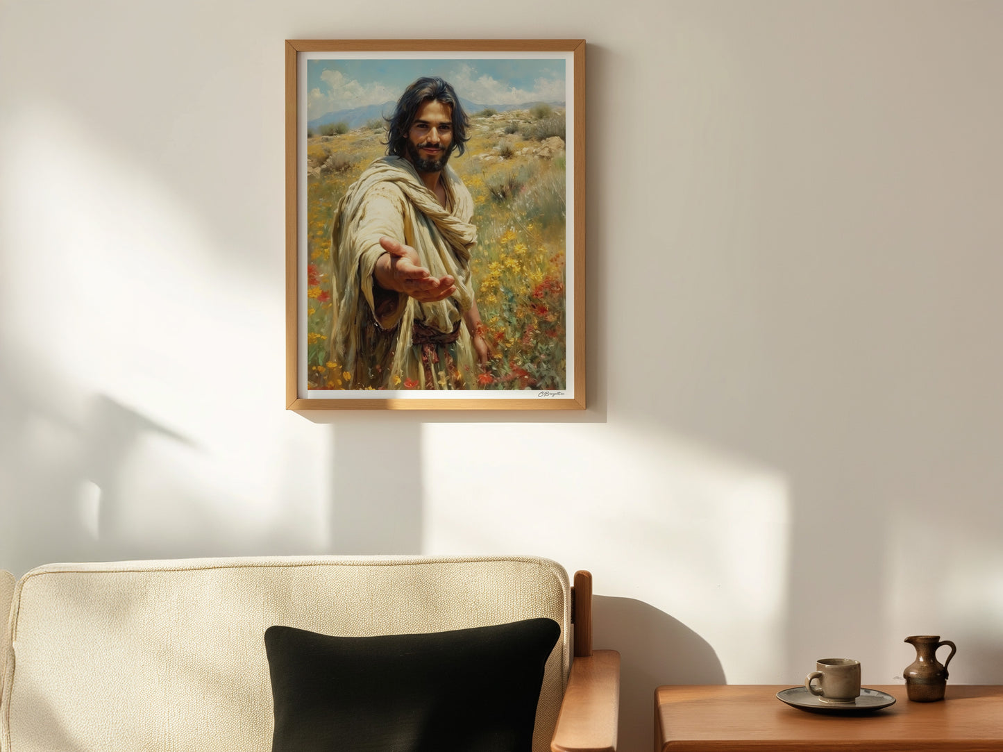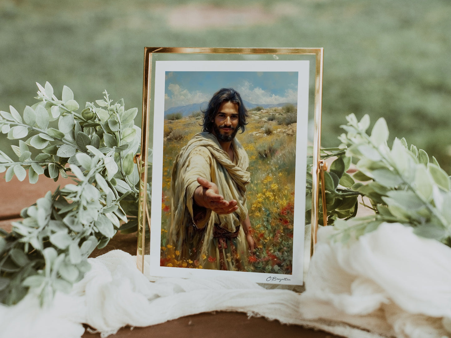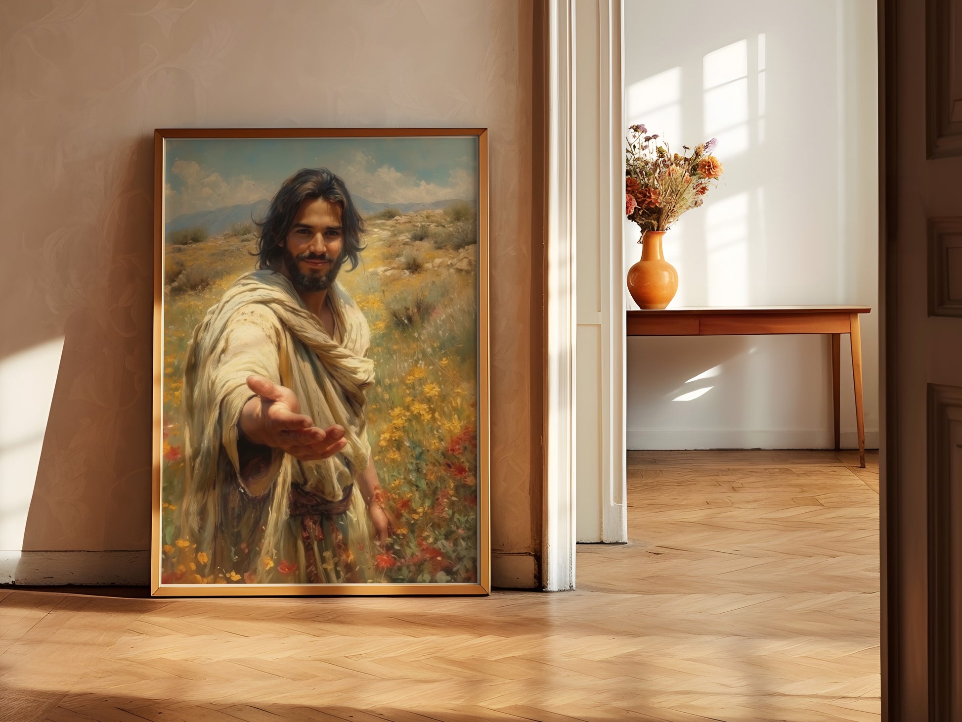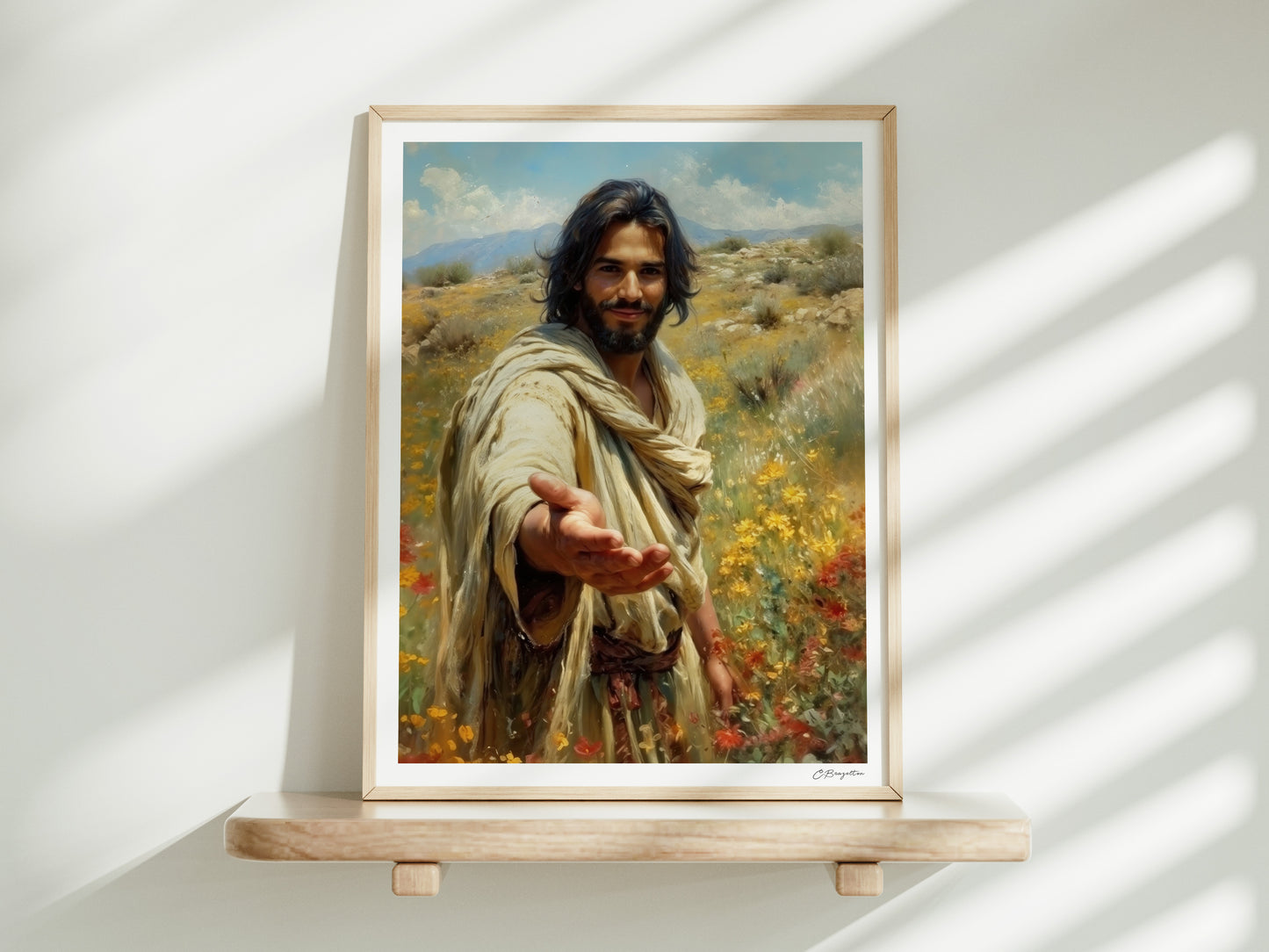 With "Come to Me," a piece from my "Come Follow Me" series I was inspired by the powerful and comforting words of Matthew 11:28-30. In this artwork, we see Jesus with a gentle smile, his hand outstretched in a warm, welcoming gesture, beckoning the viewer to come to Him, set in a tranquil field of flowers.