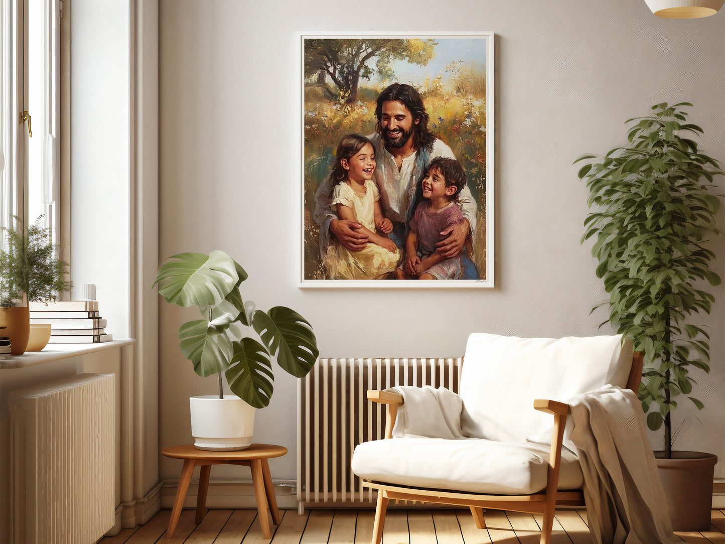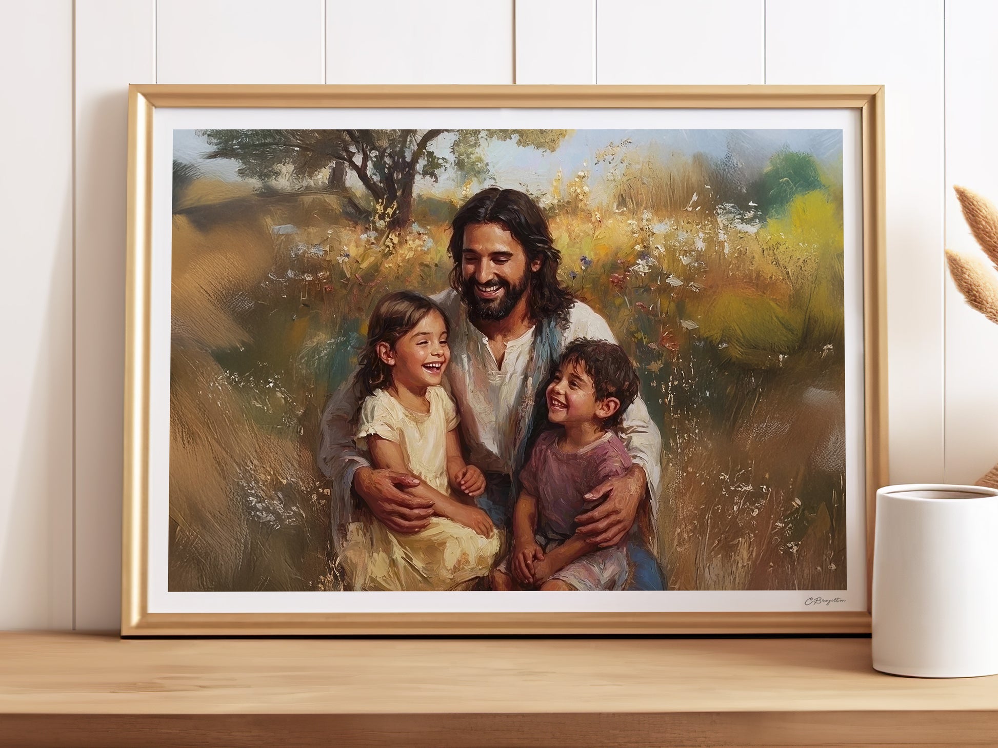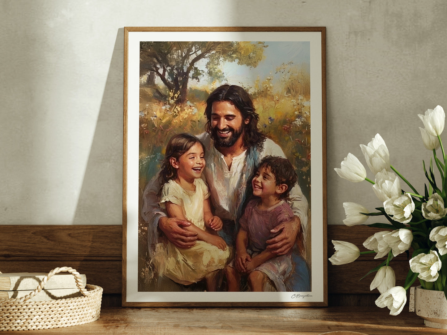 Jesus said, “Except ye be converted, and become as little children, ye shall not enter into the kingdom of heaven.” (Matthew 18:3) That verse has always stirred something deep in my heart, and that’s exactly what I tried to share in "Childlike Joy." This piece shows the Savior sitting with two little children, laughing with them, delighting in them, and letting the sunshine of heaven shine through their joy.