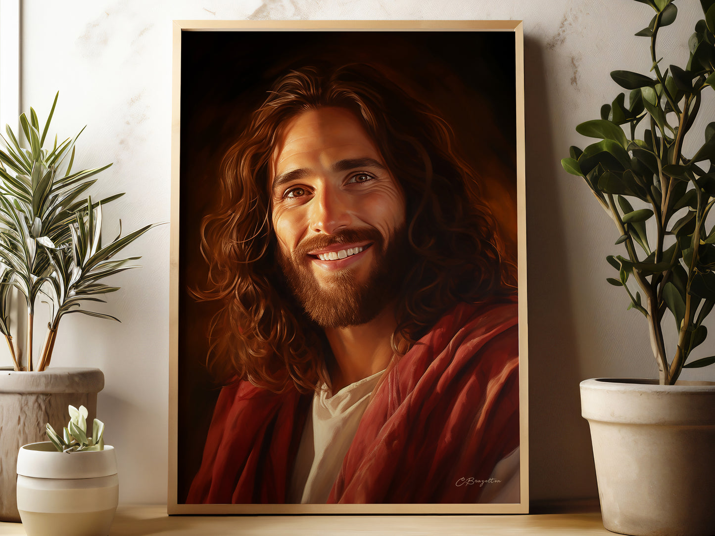 En esta representación, la sonrisa de Jesús es un faro de la luz divina y el amor que Él encarna. La calidez de Sus ojos nos invita a compartir la celebración de Su grandeza y a recordar el profundo mensaje del Salmo 96, que nos llama a "Cantad a Jehová un cántico nuevo; cantad a Jehová, toda la tierra. Cantad a Jehová". Señor, alabado sea su nombre; proclamad su salvación día tras día. Contad su gloria entre las naciones, entre todos los pueblos sus maravillas. Porque grande es el Señor y digno de alabanza."