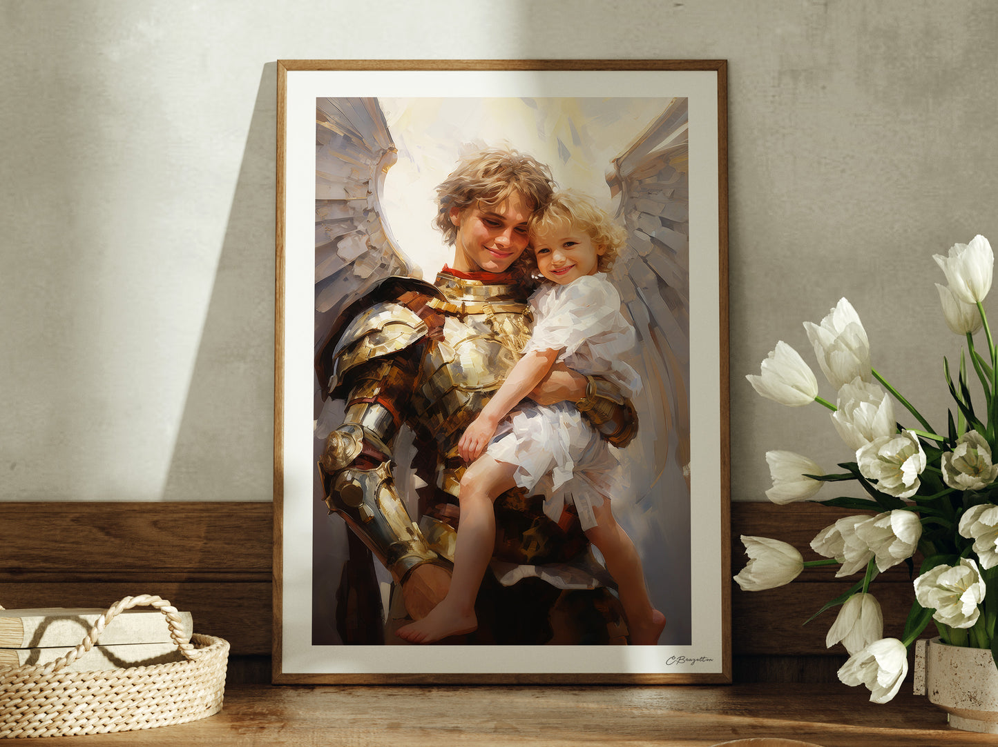 This artwork portrays a guardian angel, a divine warrior robed in radiant armor, holding a child. Their smiles reflect the joy and peace that comes from divine watchfulness. The warmth of the angel's embrace and the child's contentment capture the essence of heavenly care promised to us.