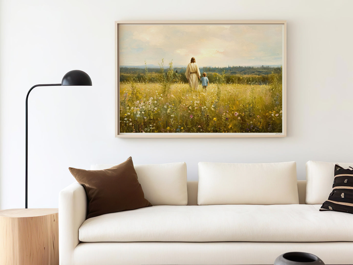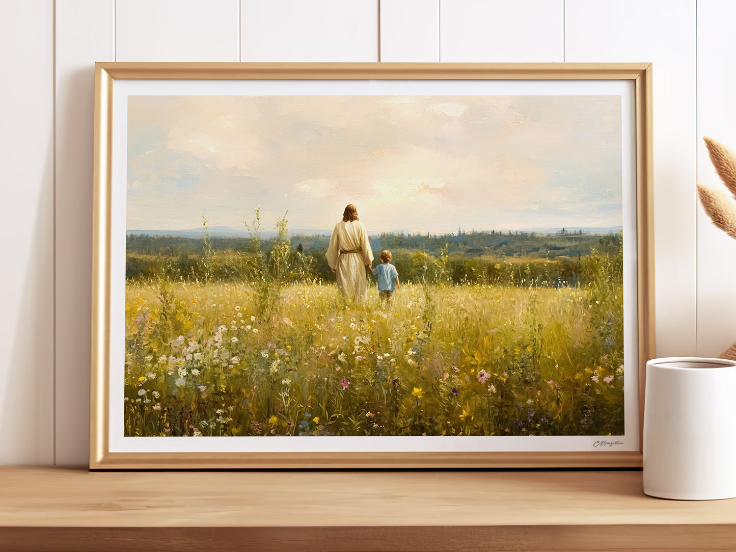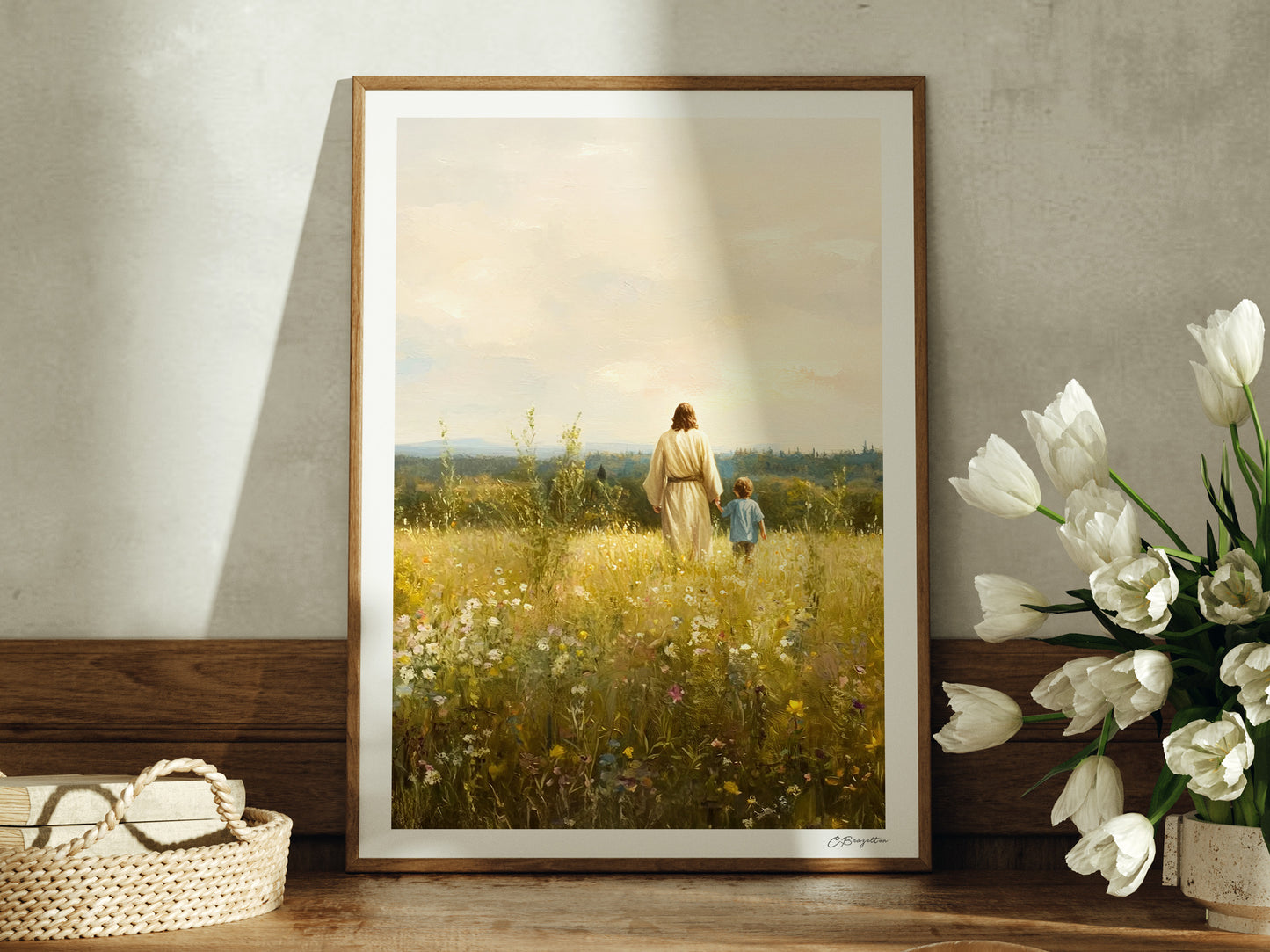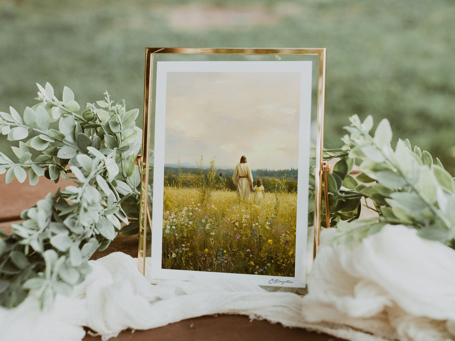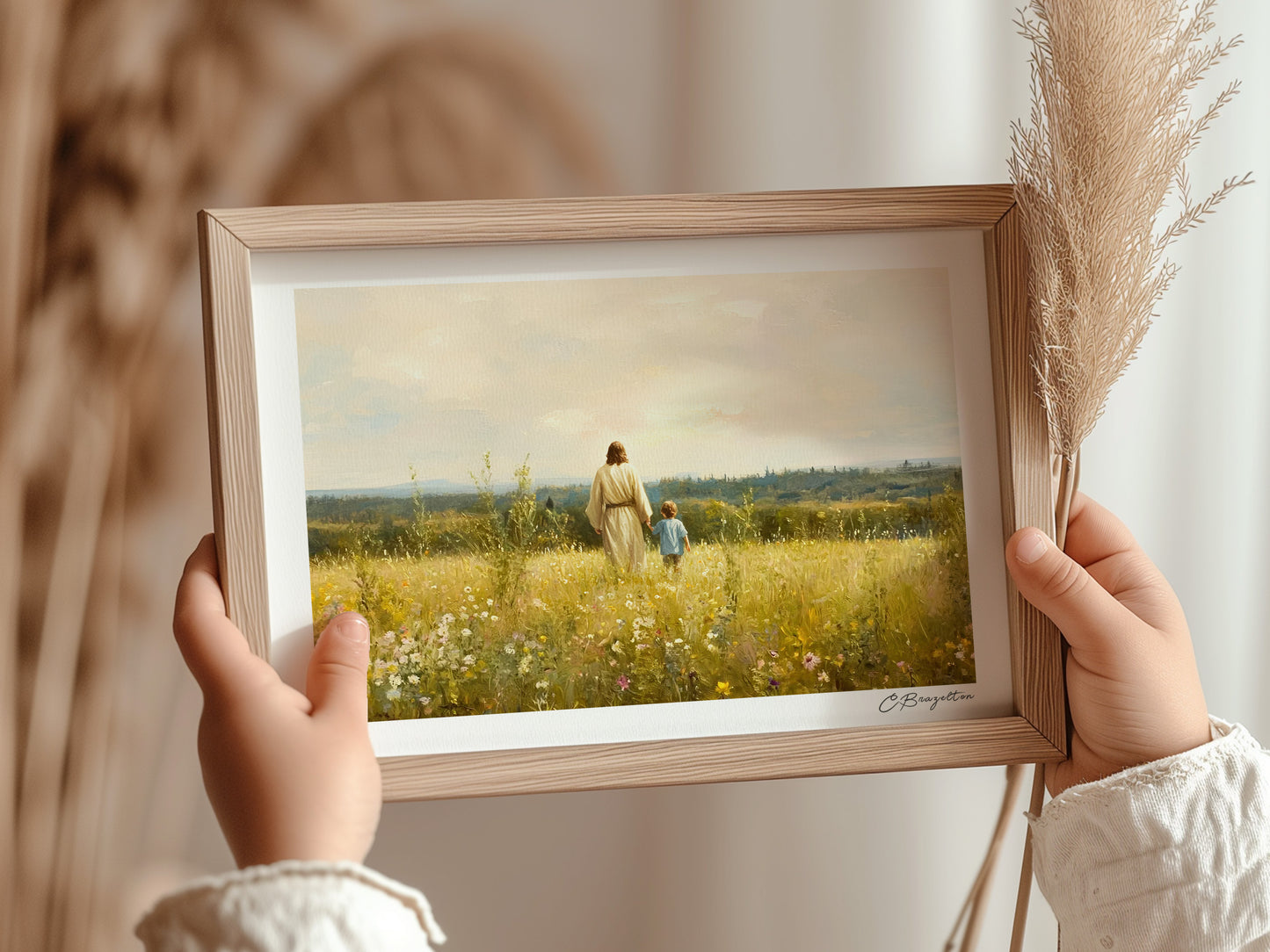 Hand in Hand, was inspired by the tender promise in Isaiah 41:13: “For I the Lord thy God will hold thy right hand, saying unto thee, Fear not; I will help thee.” In each piece, Jesus walks hand in hand with a child through a field of wildflowers—one with a young boy, the other with a young girl. Both paintings were created as a reminder that the Savior walks with our children through every step of life, guiding them with perfect love and eternal patience.
