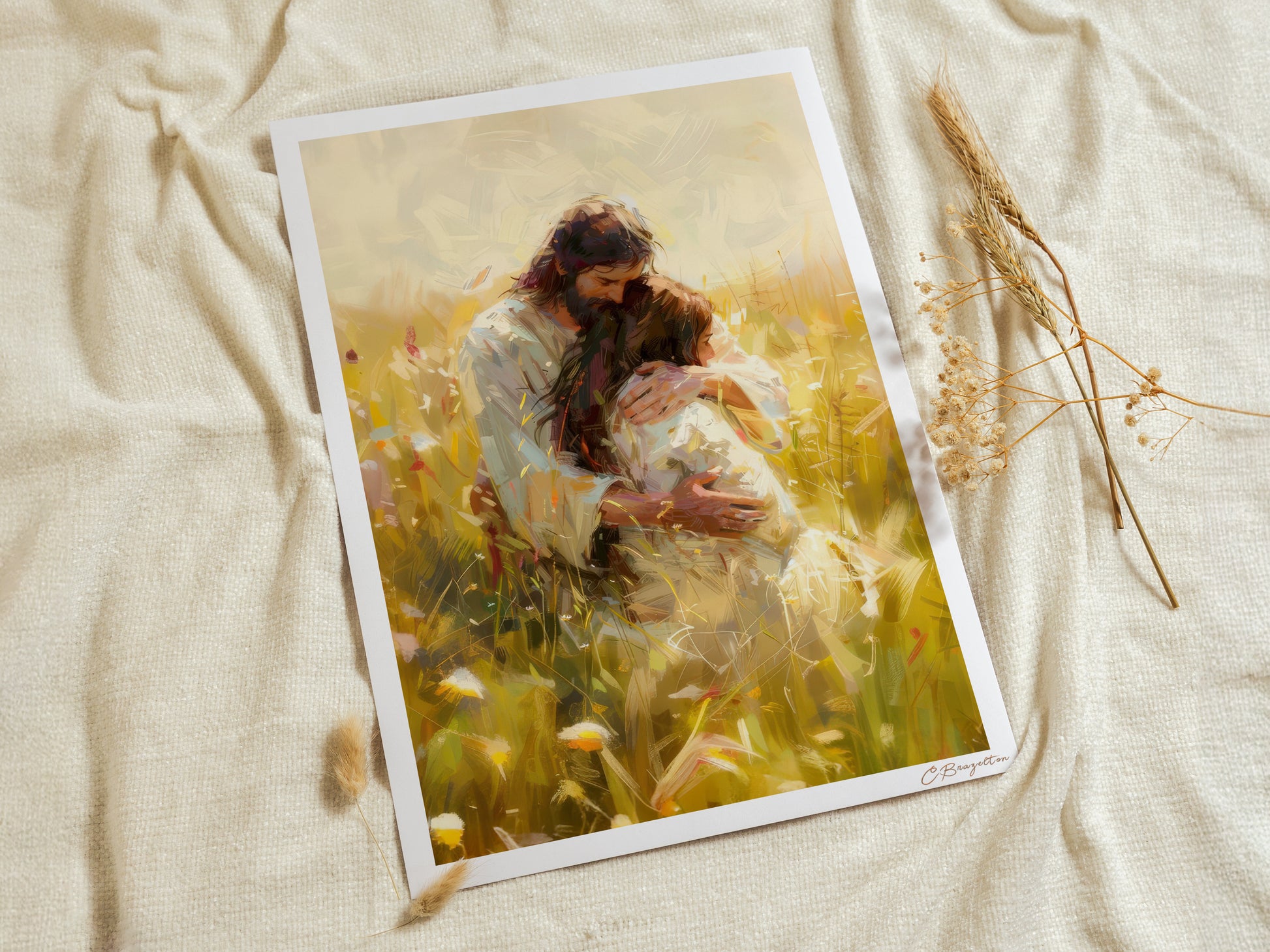What I love most about this painting is the way it shows the embrace of Christ, offering comfort and strength. The colors create a sense of peace and divine light, reflecting the gospel message that He is always there to lift our burdens and carry us through.