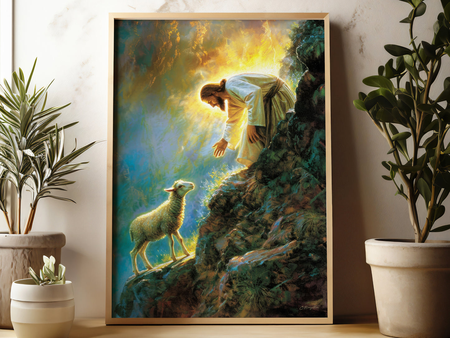 "Savior's Grace" speaks to the mercy of our Lord, depicted here reaching out to a lost lambāa reminder that He is always there to save us in our moments of need. Inspired by the powerful truth of Romans 5:8, this piece reflects the unconditional love of Jesus Christ, who demonstrates His own love toward us, in that while we were still sinners, He died for us.