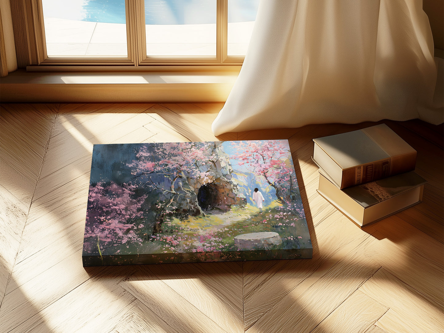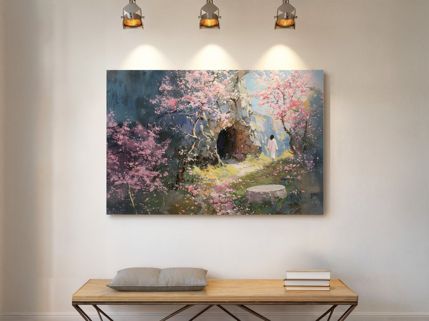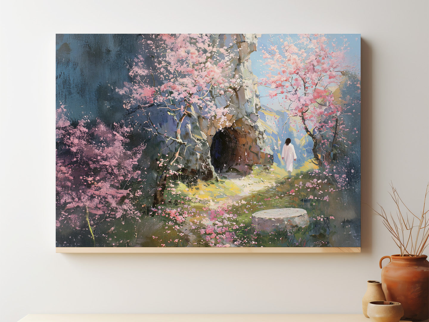 In the spirit of new beginnings and the celebration of the resurrection, I present to you "The Way in the Wilderness," a piece from my Easter Collection that captures a moment of transformation. Drawing inspiration from Isaiah 43:18-19, "Forget the former things; do not dwell on the past. See, I am doing a new thing! Now it springs up; do you not perceive it? I am making a way in the wilderness and streams in the wasteland," this painting portrays Jesus walking away from the empty tomb into a forest abloom with the fresh blossoms of spring.