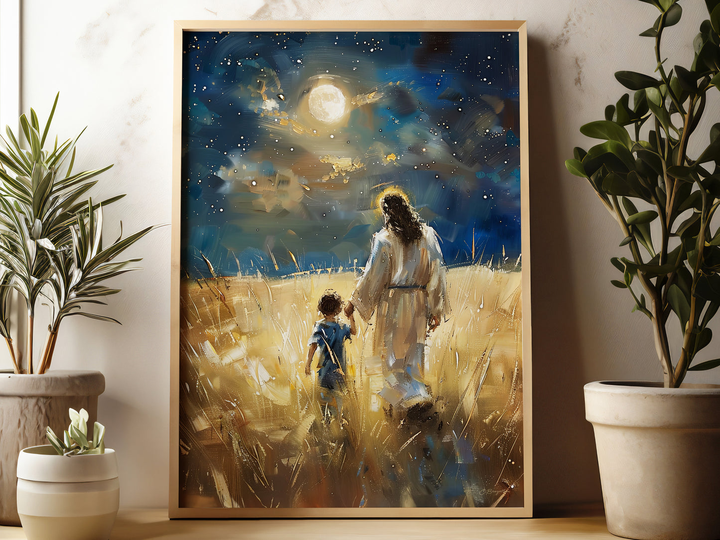 In crafting this piece, my intention was to evoke a sense of wonder and careāthe infinite Creator of the universe guiding a child through His magnificent creation. The stars glittering above serve as a reminder of our Heavenly Father's majesty and the tender care He has for each of us, His children.