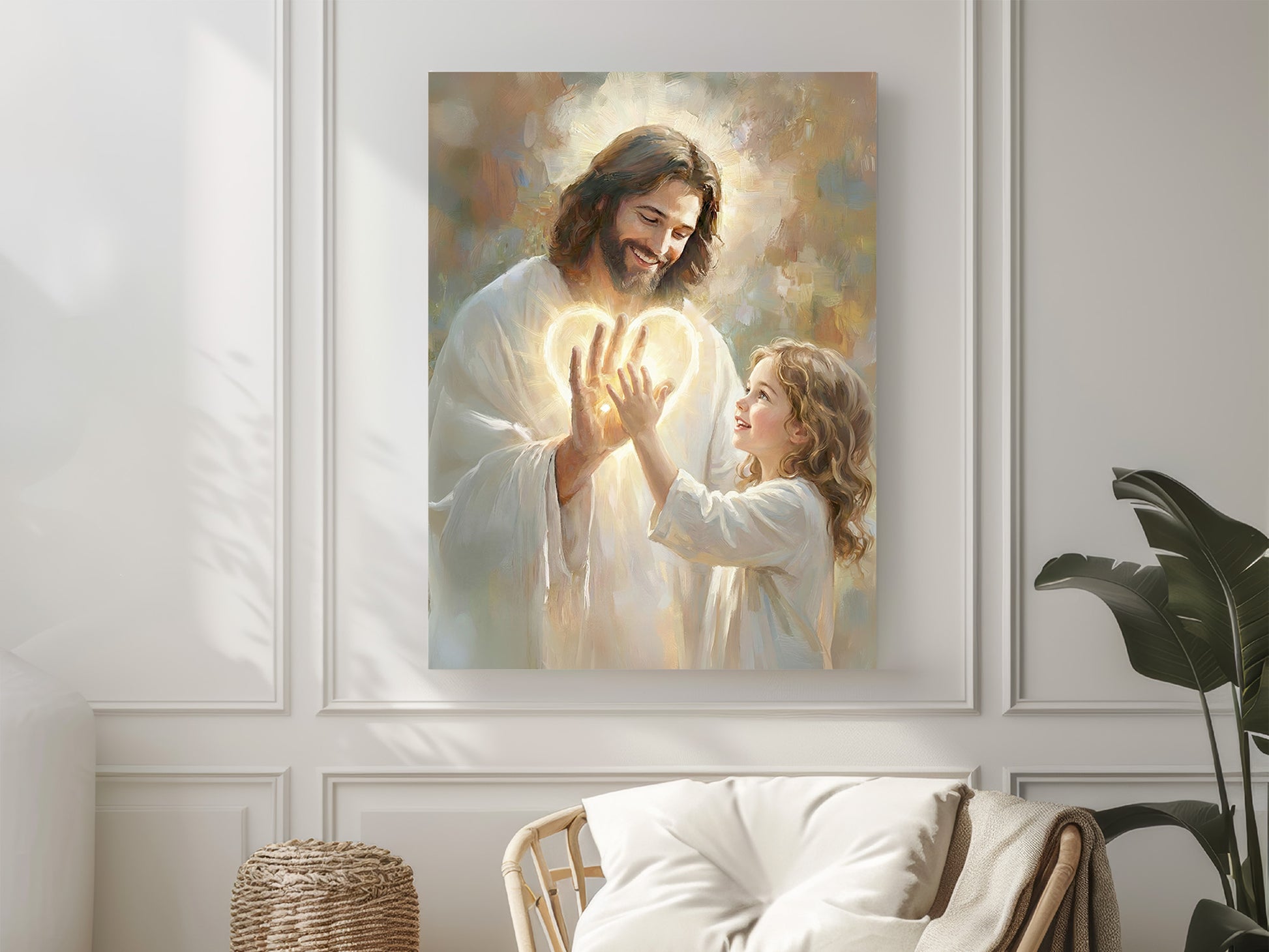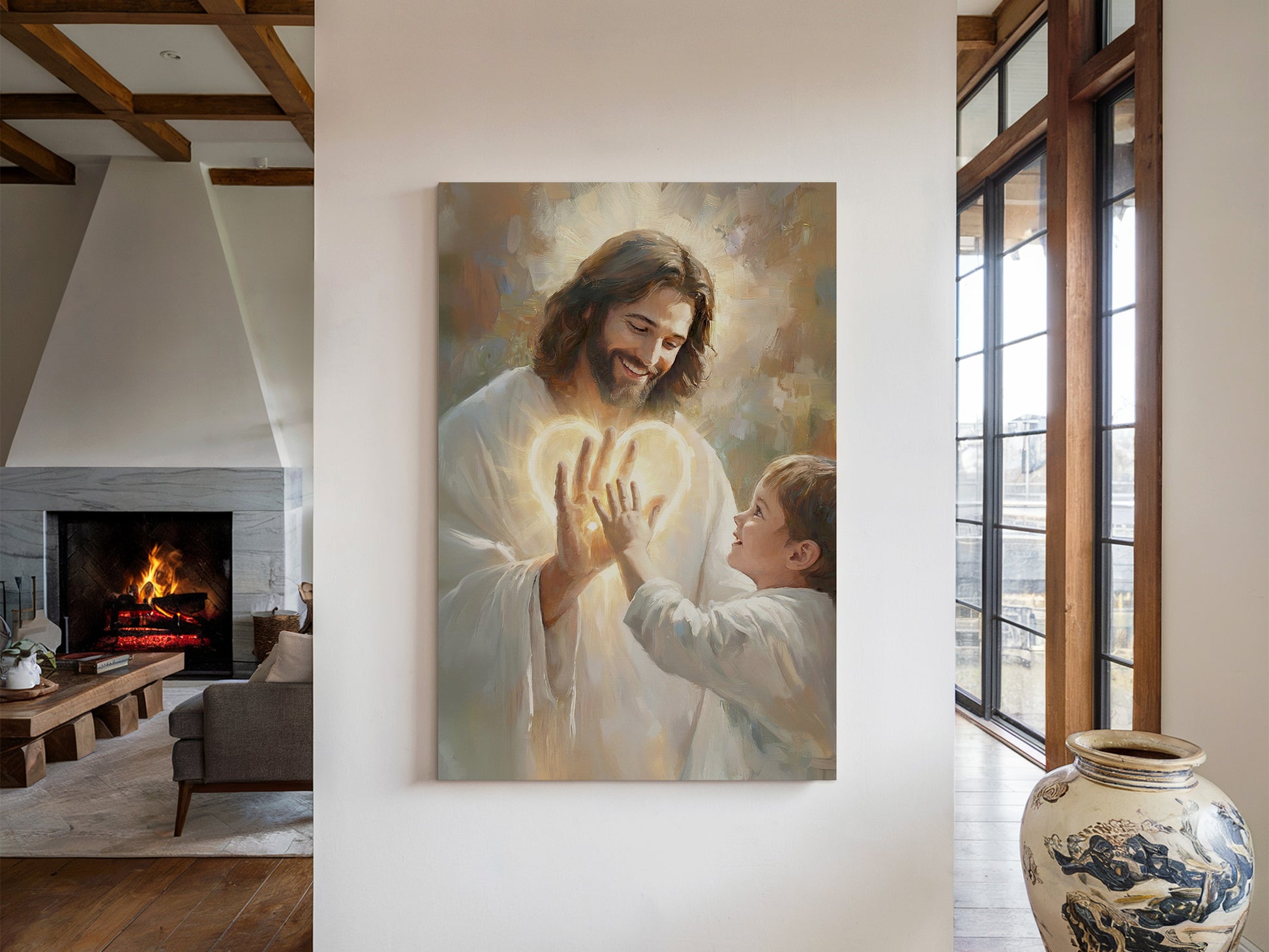 What I love most about this piece is the contrast between the scars and the light. The marks in His hands tell the story of His sacrifice, and the glowing heart behind them shows His love: warm, personal, and close. When I painted the child looking up, I wanted that moment of trust we all long for: the feeling that Jesus Christ is present and ready to hold us through fear, change, and every hard season.