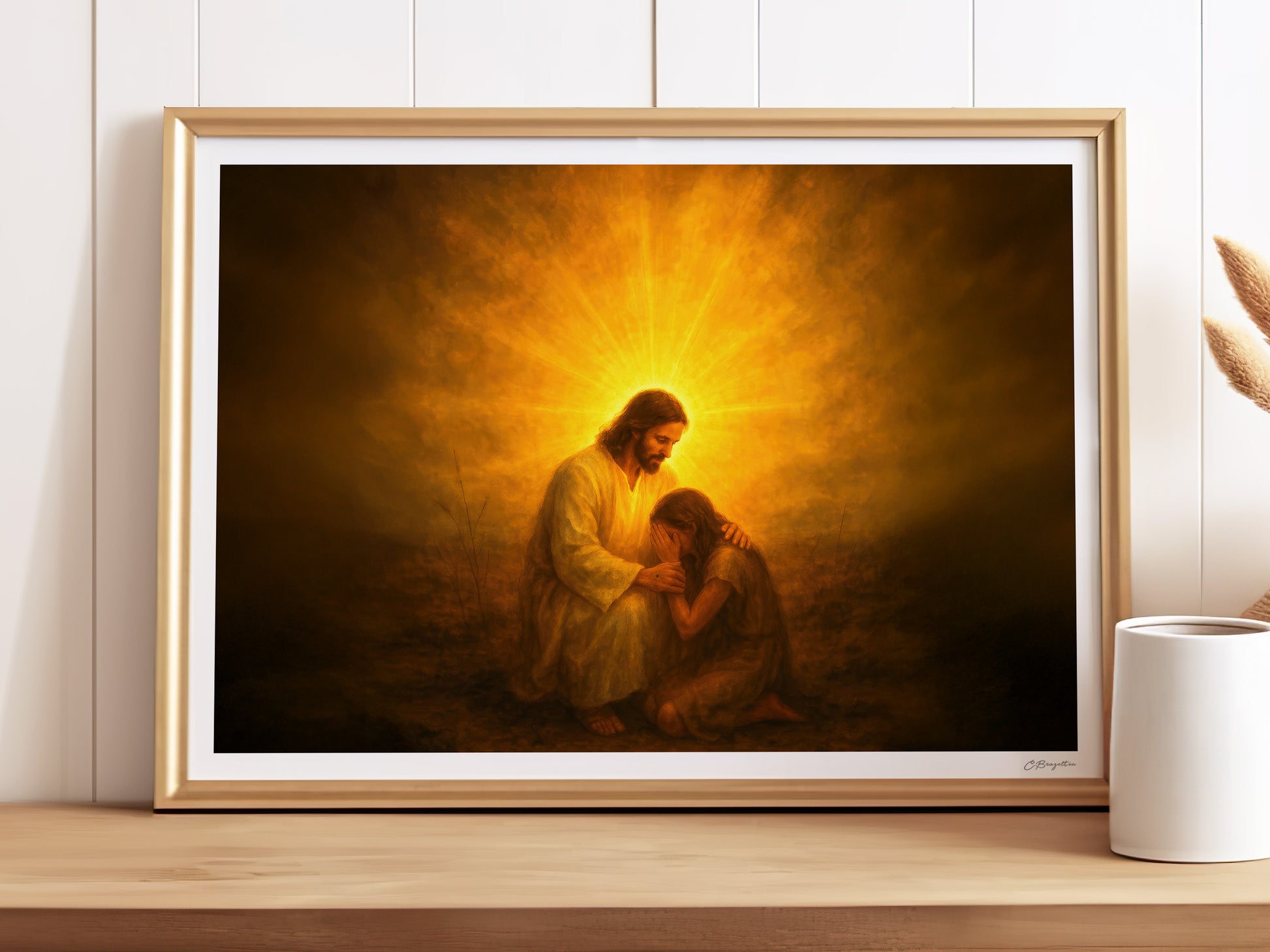 "Joy Comes in the Morning" was inspired by the promise found in Psalm 30:4–5. In this verse, the Lord reminds us that while pain and sorrow may come, they will not last forever, because joy is coming. I wanted to show that exact moment when hope breaks through the darkness. With "Joy Comes in the Morning," Jesus kneels beside a weeping woman, His radiance flooding the shadows with golden light. It symbolizes the promise that no matter how heavy the night may feel, the morning always comes with Christ.