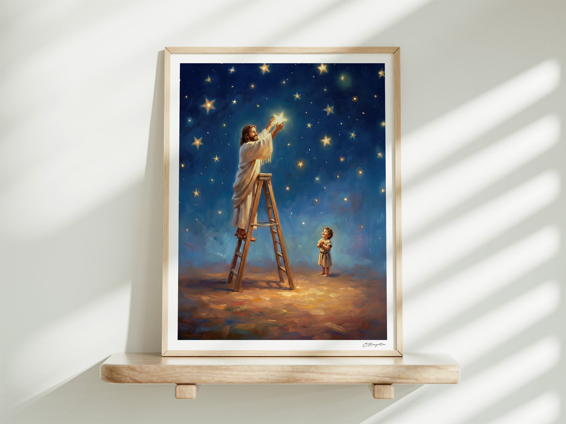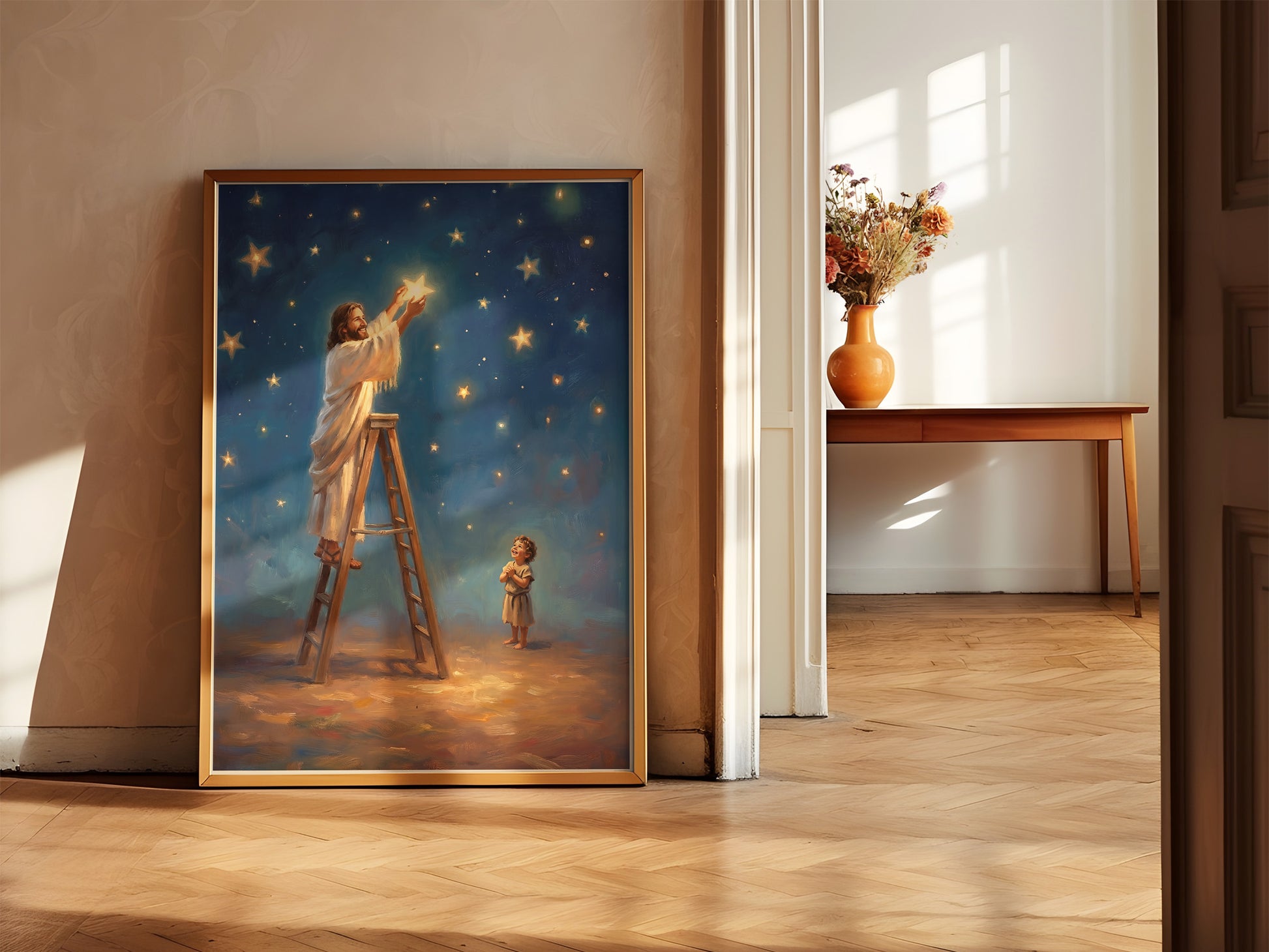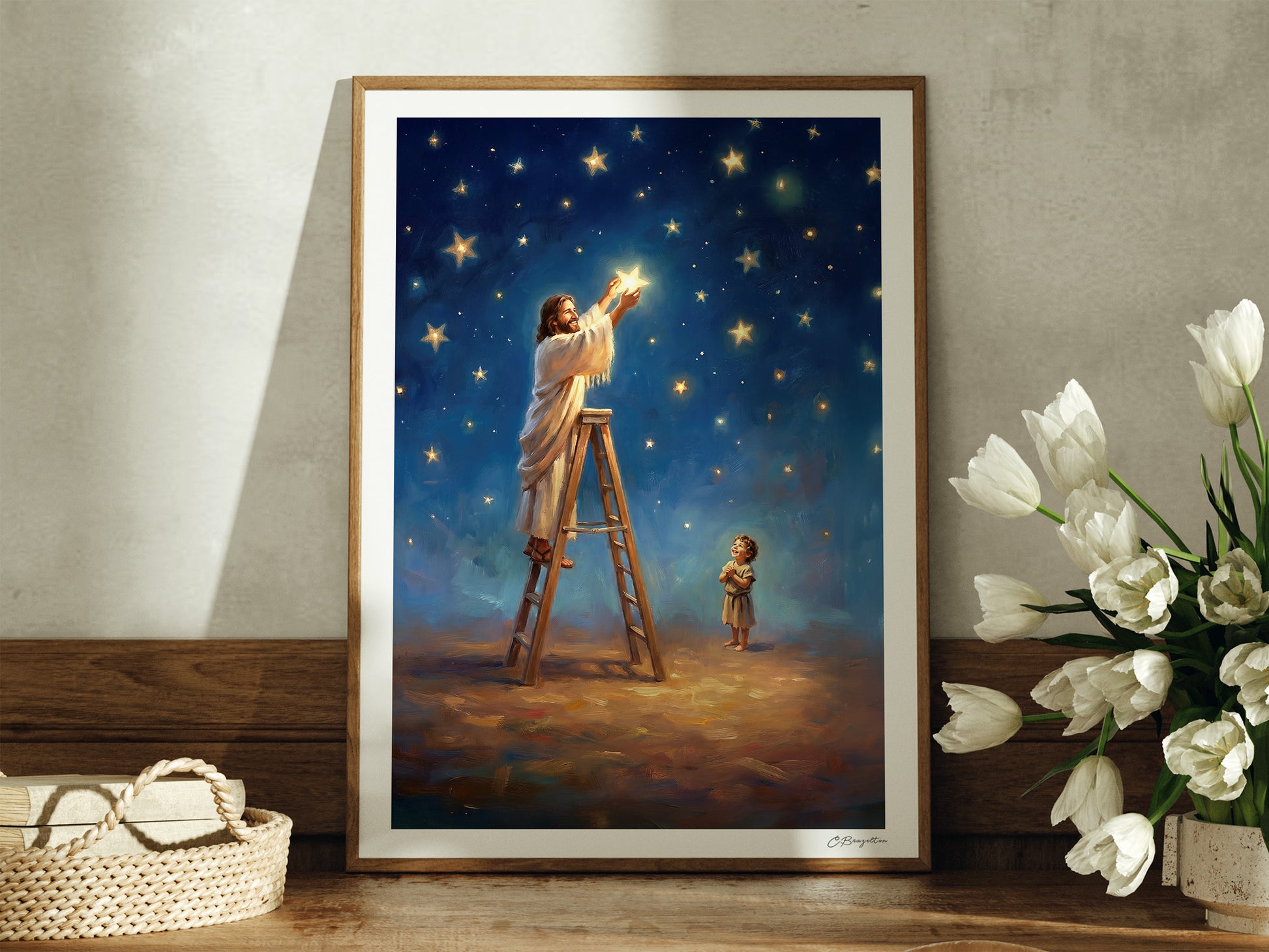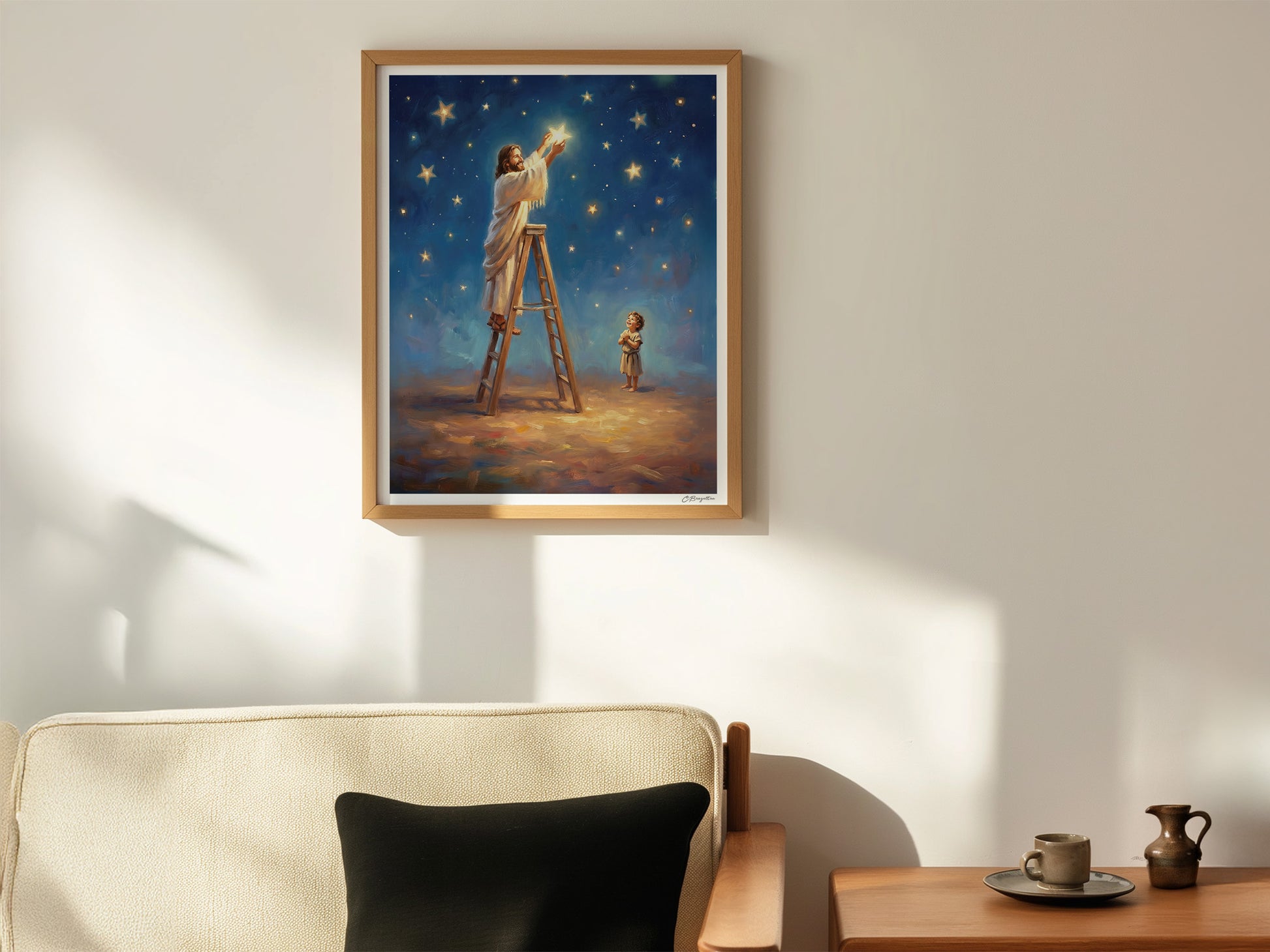 What I love most about this piece is the warmth in the light. The stars feel alive, and the whole sky feels safe. I also love the child’s expression. That wide-eyed wonder is the feeling I pray we keep when we think about the Savior. In the gospel, we learn that He is not far away. He is personal. He sees the one. He understands our hearts. If He can name the stars, He can guide His children, one by one, back to Heavenly Father.