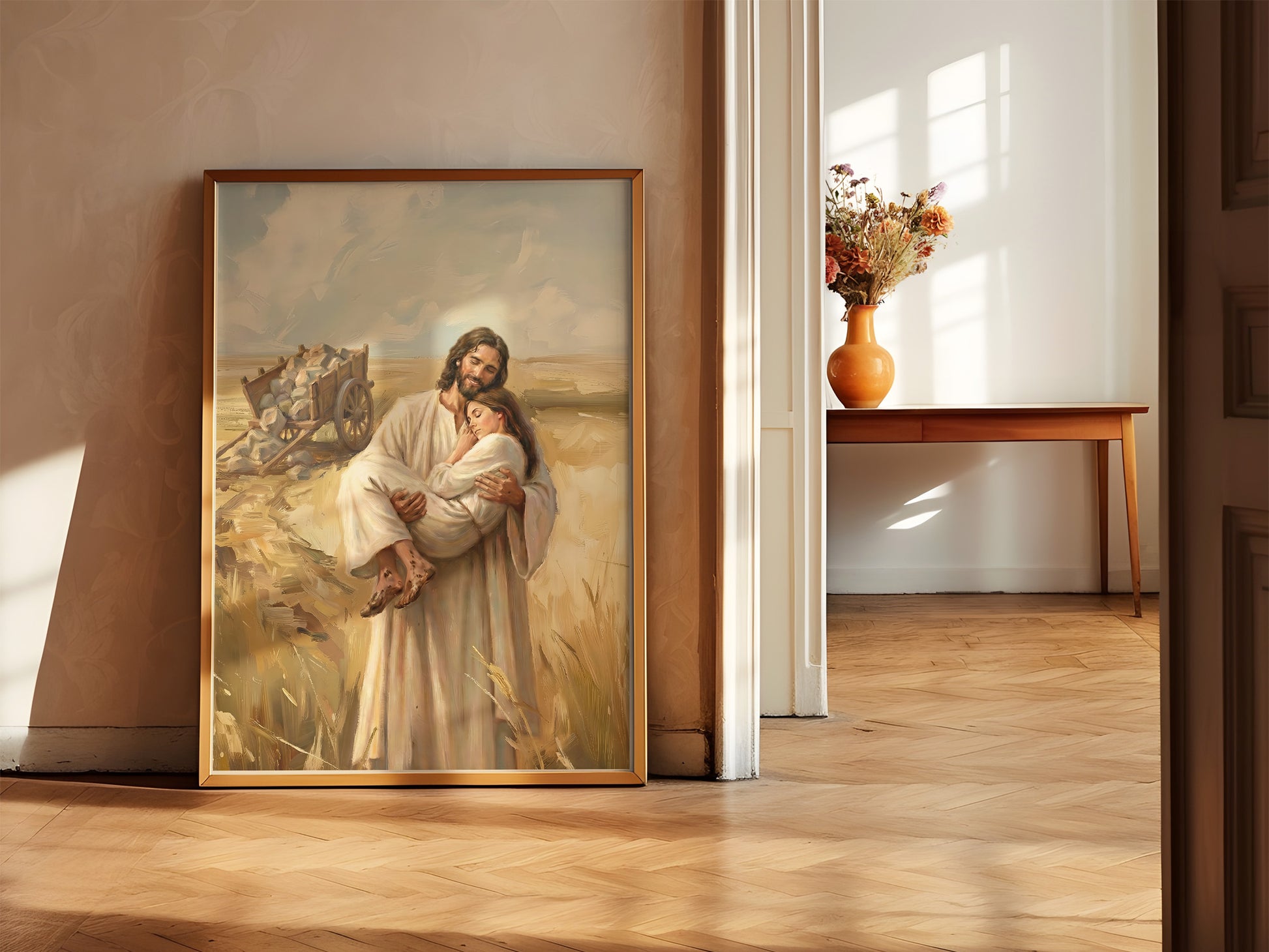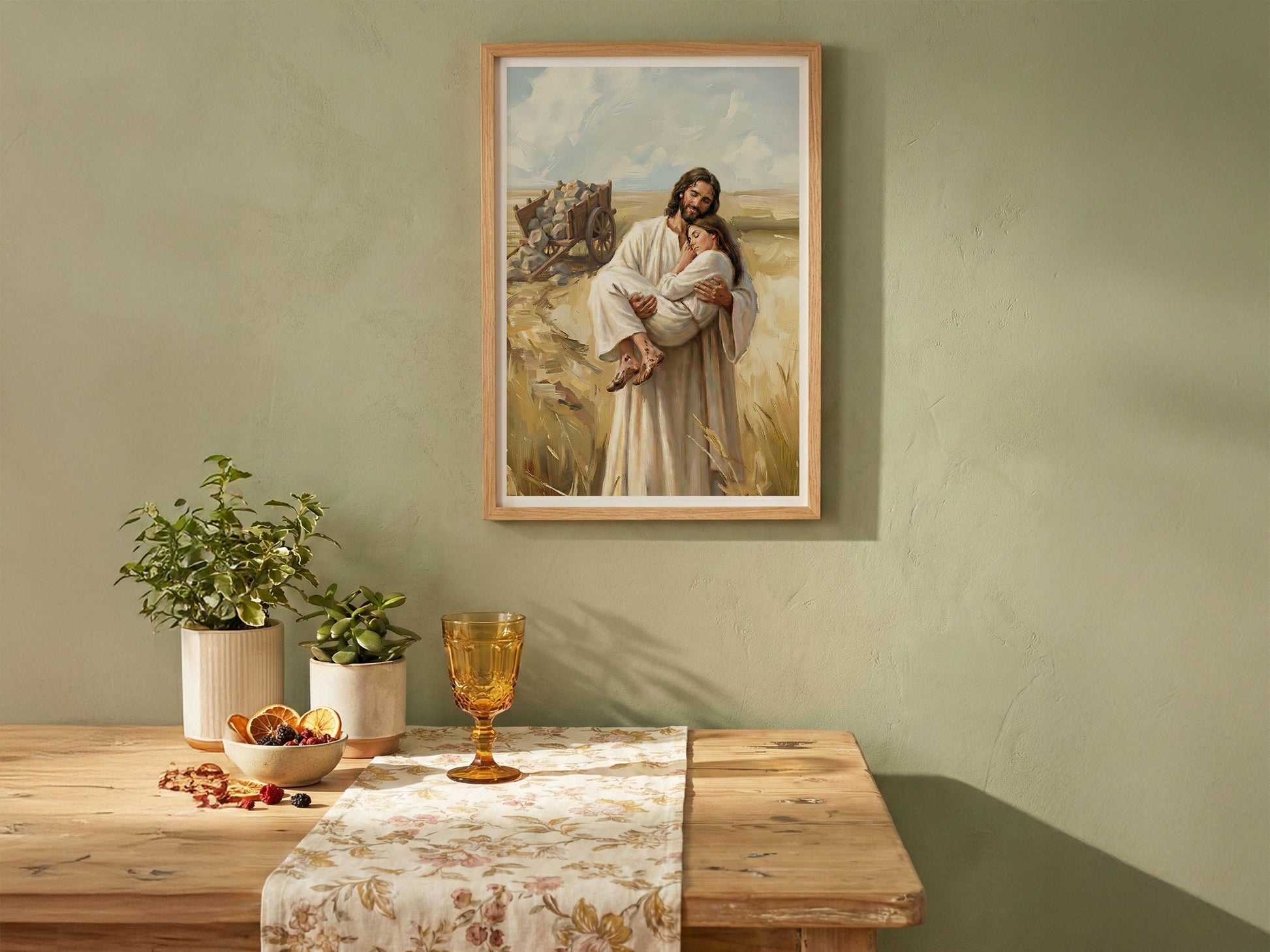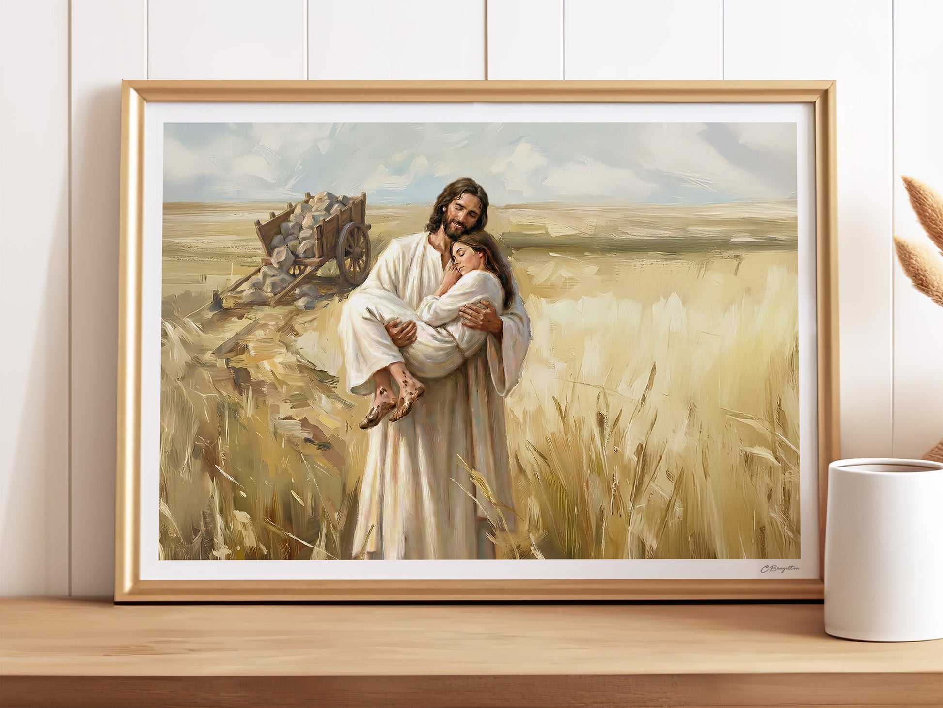 This painting also makes me think of the weekly rhythm of turning to the Savior again and again. Some weeks, scripture study feels easy and bright. Other weeks, it feels like you’re dragging a cart through dry ground. If you’ve ever opened your manual tired, prayed with a weary heart, or tried to keep going for your family, this artwork is for you. The Savior honors those small efforts, and He meets us with comfort.
