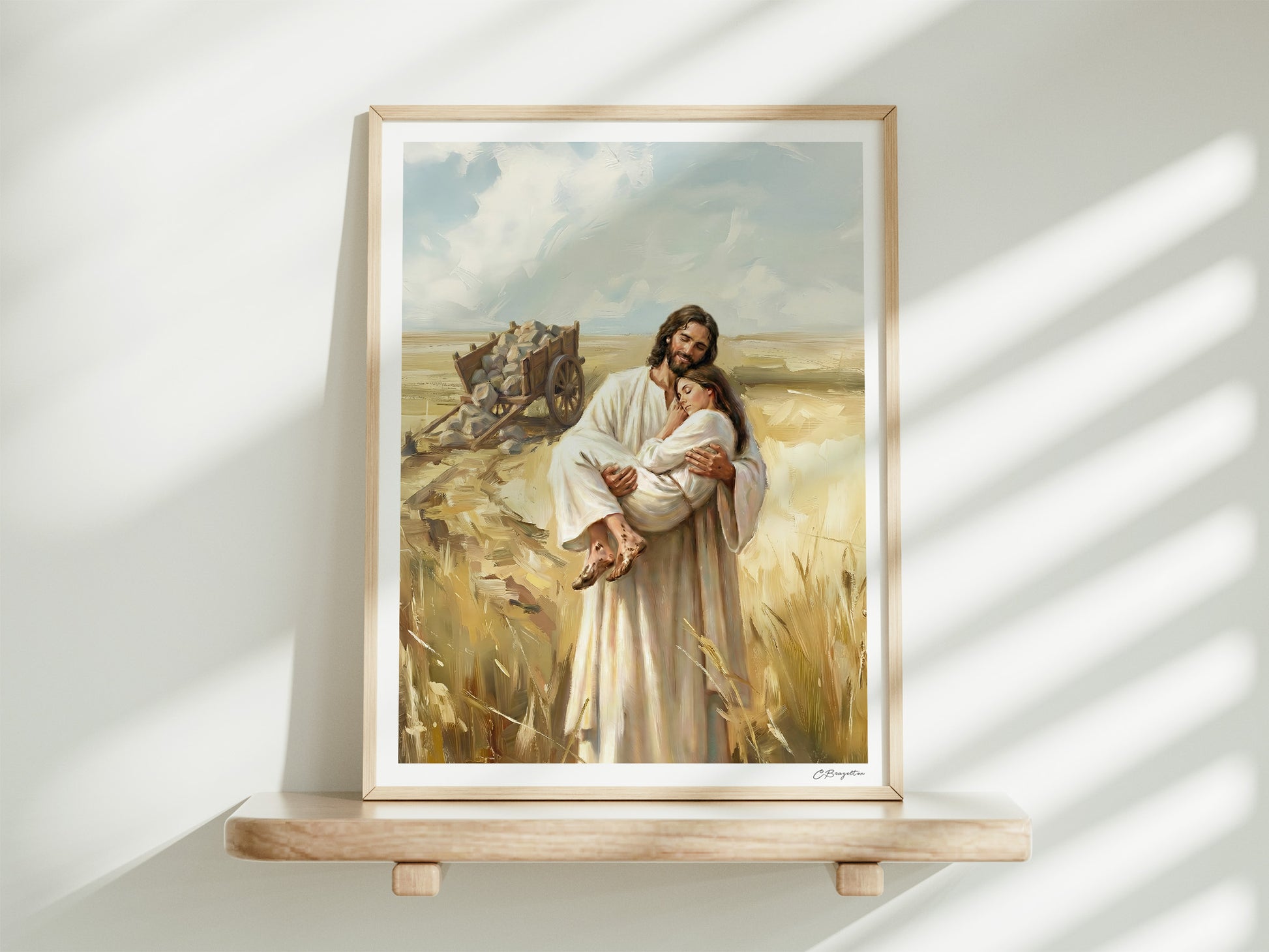 One thing I love most about this piece is the contrast between the cart of stones and the peacefulness of resting in the Savior's arms. The stones feel like worries, guilt, exhaustion, grief, and everything else we try to haul alone. But He does not shame us for being tired. He lifts. He heals. He strengthens. That is the heart of the gospel: because of His Atonement, we don’t have to stay crushed by our burdens. We can bring them to Him and find real rest.