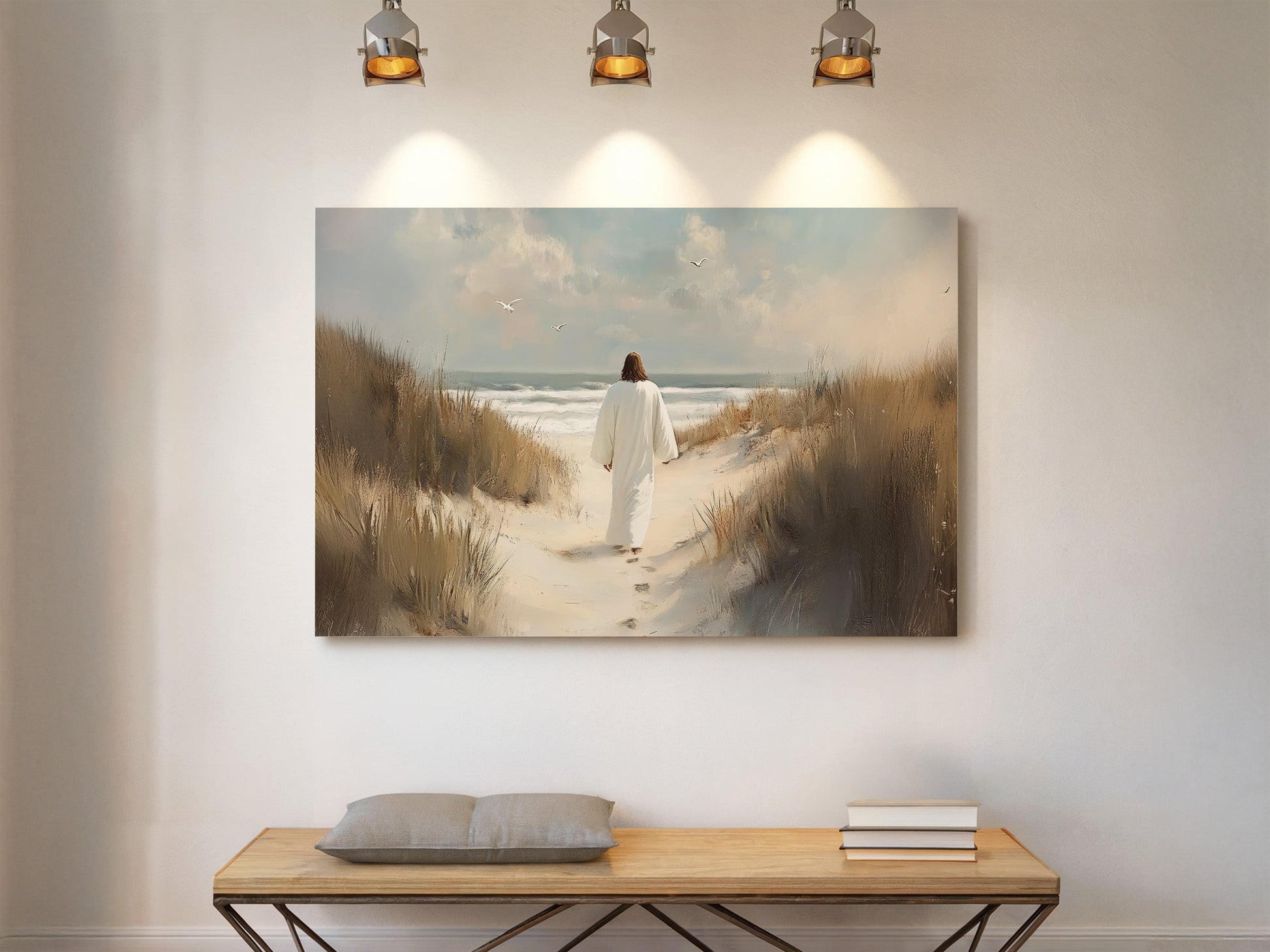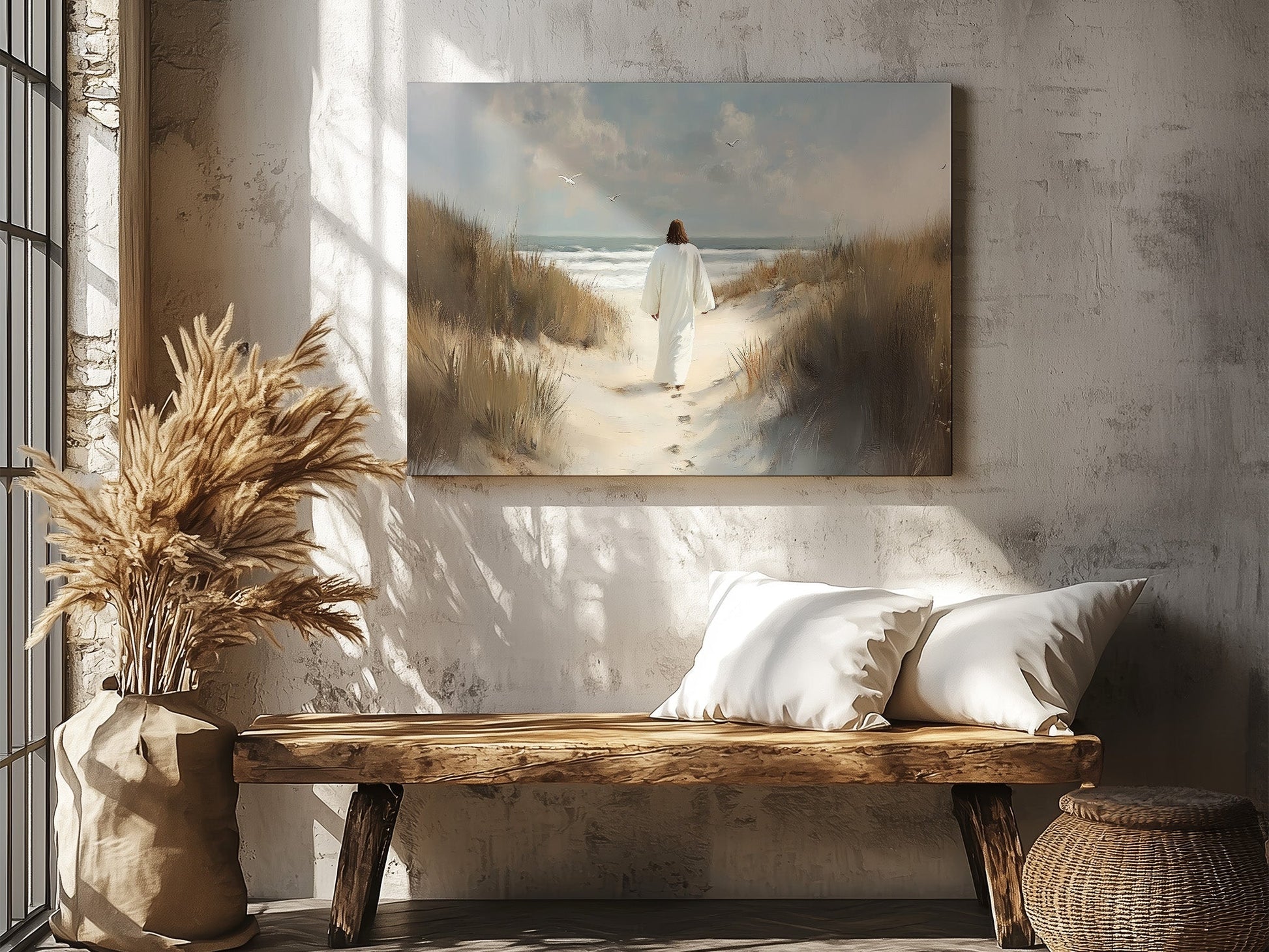 What I love most about this painting is the peace and calm that I feel every time I see it. The soft colors and the gentle waves in the background create a scene of tranquility, perfectly symbolizing Christ’s invitation to rest. You can almost hear the quiet whisper of His voice, urging you to walk with Him, to trust in His guidance, and to find comfort in His love.